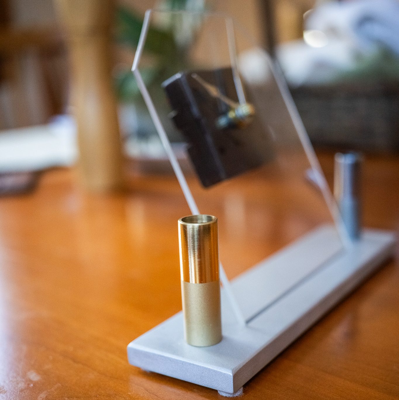 The clock could be made more efficiently by swapping the manually milled aluminum base with CNC machining all of the features. The brass pen holder, steel pen holder, and nut could be made on a CNC lathe too making the manufacturing much faster. Making parts in large batches and using pre made fixtures like the one used to cut the slot to hold the acrylic would cut down on setup time. we could also eliminate the manual deburring process by tumbling all parts, Overall this would cut time and cost, and theoretically you could completely automate almost this entire process.